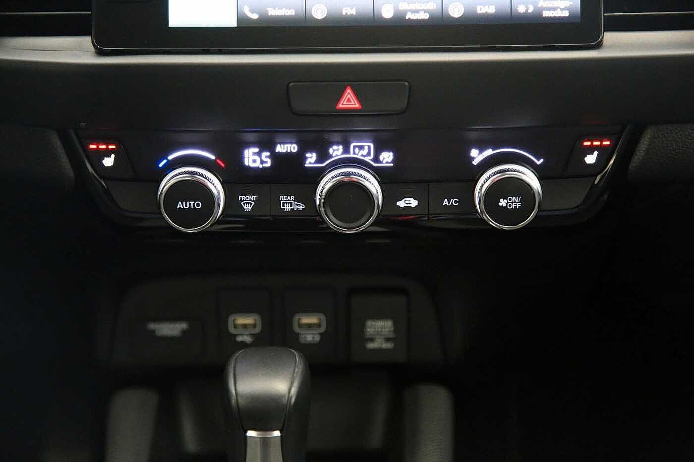 8 Lautsprecher, Airbag Beifahrerseite abschaltbar, Airbag Fahrer-/Beifahrerseite, Aktive Kopfstützen vorn, Anhänger-Stabilisierungs-Programm (TSA), Anzeige für Reifendruck im Display, Autom. Begleitfunktion der Beleuchtung (Coming Home, Leaving Home), Automatische Fahrlichtschaltung / Lichtsensor, Außenspiegel elektr. anklappbar, Außenspiegel elektr. verstell- und heizbar, beide, Außenspiegel mit Bordsteinautomatik, rechts, Außenspiegel silber lackiert, Blinkleuchte in Außenspiegel integriert, Bremsassistent, Dachreling, Einparkhilfe vorn und hinten, Elektr. Bremskraftverteilung, Elektromotor 80 kW (Hybridantrieb), Fahrassistenz-System: Berganfahrhilfe, Fahrassistenz-System: Eco Assist (Econ Modus), Fahrassistenz-System: Fernlichtassistent (HSS), Fahrassistenz-System: Intelligente Geschwindigkeitsanpassung (Tempomat) mit Abstandsregelung I-ACC, Fahrassistenz-System: Kollisionswarnsystem mit Bremseingriff und Fußgängererkennung (CMBS), Fahrassistenz-System: Sicherheitssystem mit automatischem Notruf (ERA GLONASS / eCall), Fahrassistenz-System: Spurhalteassistent (LKAS / LDW), Fahrassistenz-System: Spurverlassenswarnung (Lane Departure Warning, LDW), Fahrassistenz-System: Stauassistent (LSF), Fahrassistenz-System: Verkehrszeichenerkennung, Fensterheber elektrisch vorn und hinten, mit Auf-/Ab-Automatik, Freisprecheinrichtung (Bluetooth) mit Sprachsteuerung, Gepäcknetz an Vordersitzlehne links, Gepäcknetz an Vordersitzlehne rechts, Gepäckraumabdeckung / Rollo, Getriebe Automatik stufenlos - ECVT, Getränkehalter vorn, Gurtstraffer, Heckleuchten LED, Hybrid 80 kW (Motor 1,5 Ltr. - 72 kW), Infotainment-System: Honda Connect mit 9" Touchscreen / Garmin Navi / Internetbasierende Dienste / DAB-Tuner, Isofix-Aufnahmen für Kindersitz, Karosserie: 5-türig, Klimaautomatik, Knieairbag Fahrerseite, Kopf-Airbag-System, Lenksäule (Lenkrad) höhenverstellbar, Leseleuchten vorn, LM-Felgen, Motorsound-System (Acoustic Vehicle Alerting System, AVAS), Multi-Info-Display (i-MID), Multifunktion für Lenkrad, Nebelscheinwerfer LED, Otto-Partikelfilter (OPF), Parkbremse elektrisch, Reifen-Reparaturset, Rückfahrkamera, Rücksitz geteilt / klappbar, Rücksitze im Fahrzeugboden versenkbar, Schadstoffarm nach Abgasnorm Euro 6d, Schalt-/Wählhebelgriff Leder, Scheinwerfer LED, Seitenairbag hinten, Seitenairbag vorn, Seitenairbag vorn mitte (Center-Airbag), Sitz vorn links höhenverstellbar, Sitzbezug / Polsterung: Stoff, Sitzheizung vorn, Smartphone Schnittstelle (Apple CarPlay & Android Auto), Sonnenblenden mit Make-up-Spiegel, Steckdose (12V-Anschluß) in Armaturentafel, USB-Ladeanschluß hinten (2-fach), USB-Ladeanschluß vorn, USB-Schnittstelle, Verglasung hinten abgedunkelt (Privacy Glass)