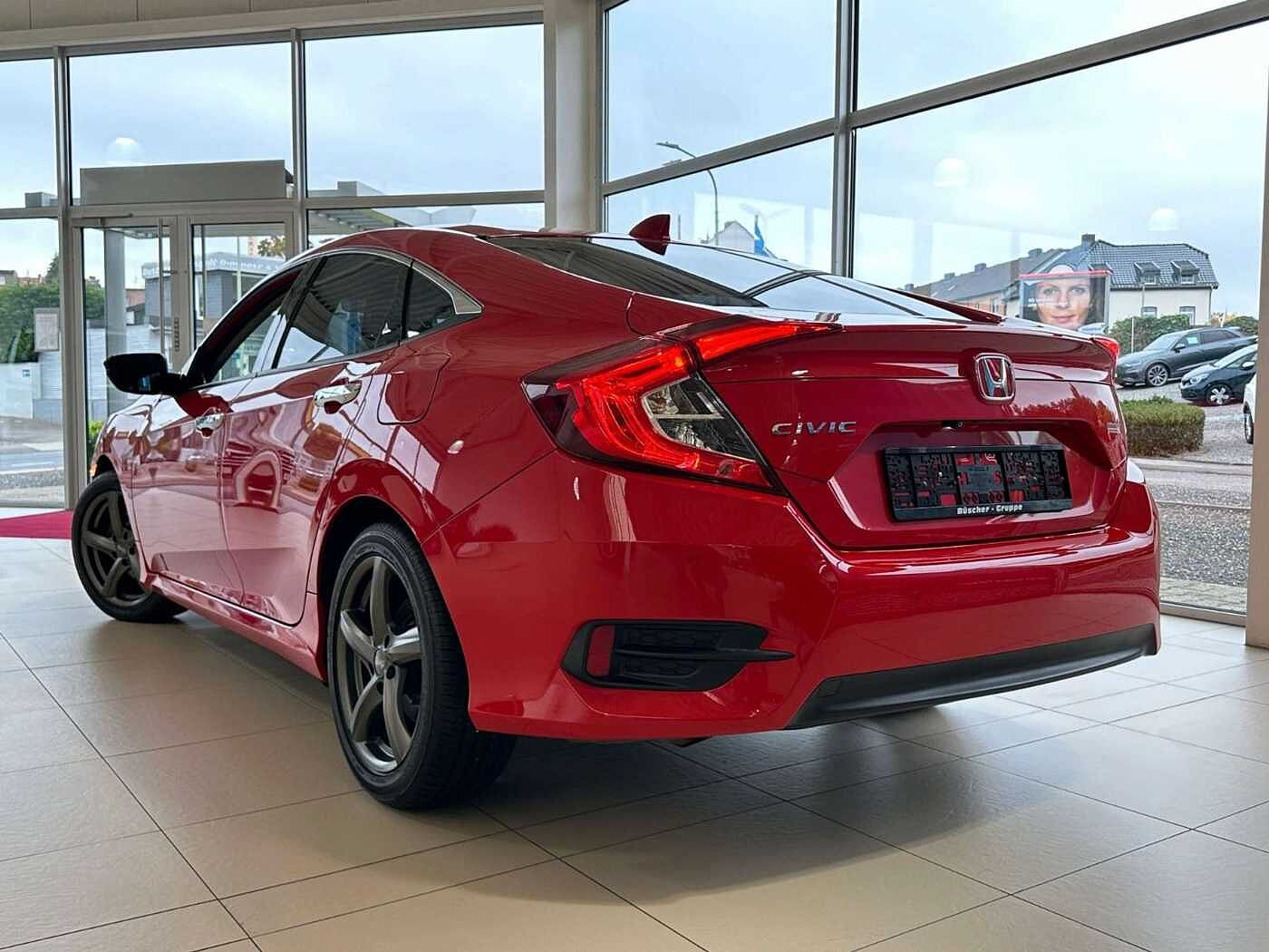 Dieser gepflegte Honda Civic Limousine aus dem Jahr 2018 überzeugt durch seine umfangreiche Ausstattung und moderne Technik. Der 182 PS starke Benzinmotor mit 1498 ccm Hubraum und 4 Zylindern bietet ein dynamisches Fahrerlebnis mit Frontantrieb und manuellem Schaltgetriebe. Die rote Metallic-Lackierung verleiht dem Fahrzeug einen sportlichen Charakter. Im Innenraum profitieren Sie von einer 2-Zonen-Klimaautomatik, beheizten Sitzen, Lederlenkrad und zahlreichen Komfortfunktionen wie Bluetooth, Navigationssystem, Touchscreen und WLAN-Hotspot. Sicherheit wird großgeschrieben mit umfangreichen Airbags, Kollisionsvermeidungssystem, Spurhalteassistent, adaptivem Tempomat und Verkehrszeichenerkennung. Die Einparkhilfe vorne und hinten sowie die Rückfahrkamera erleichtern das Rangieren im Stadtverkehr. Der Civic erfüllt die Euro-6-Norm und trägt die grüne Umweltplakette.
